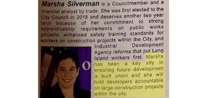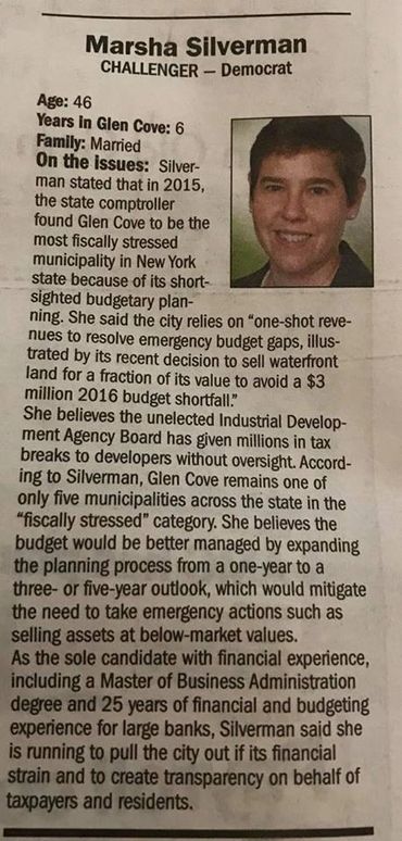 "Now finishing her first-term, Silverman has become an essential part of the City Council, as she is the only financial analyst on the board. Her experience and dedication to Glen Cove have brought much-needed fiscal management to the city, and her push for the city to think about long-term financial planning is necessary for the city to thrive."
